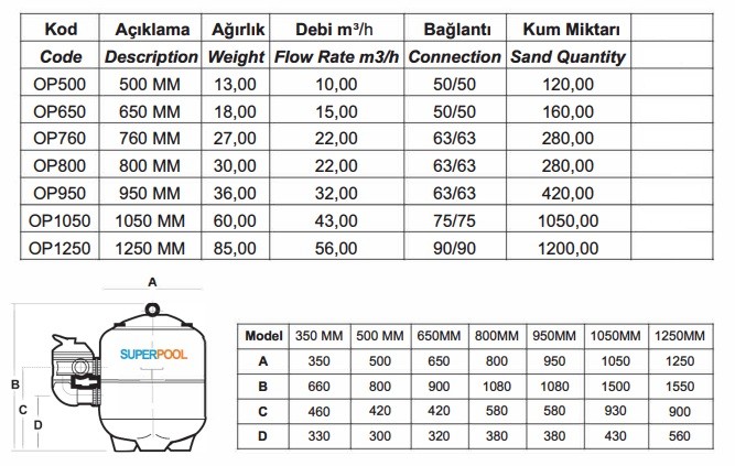 | * UV'ye dayanıklı yüzeyi ile uzun süre güneş ışığı altında bile yıllarca güvenilir bir şekilde çalışır. * SPP serisi filtreler 6 konumlu , 1,5'' & 2,0'' çok yollu vana ile beraber verilir. Özellikler * Maksimum çalışma basıncı 1,5 bar. * Maksimum test basıncı 4 bar. * Maksimum sıcaklık 43'C (109'F) * Evrensel standartlarda sağlanan boru bağlantısı * Önerilen kum boyutları; 0,5-1,00 mm 1,00-300 mm 3,00-5,00 mm |