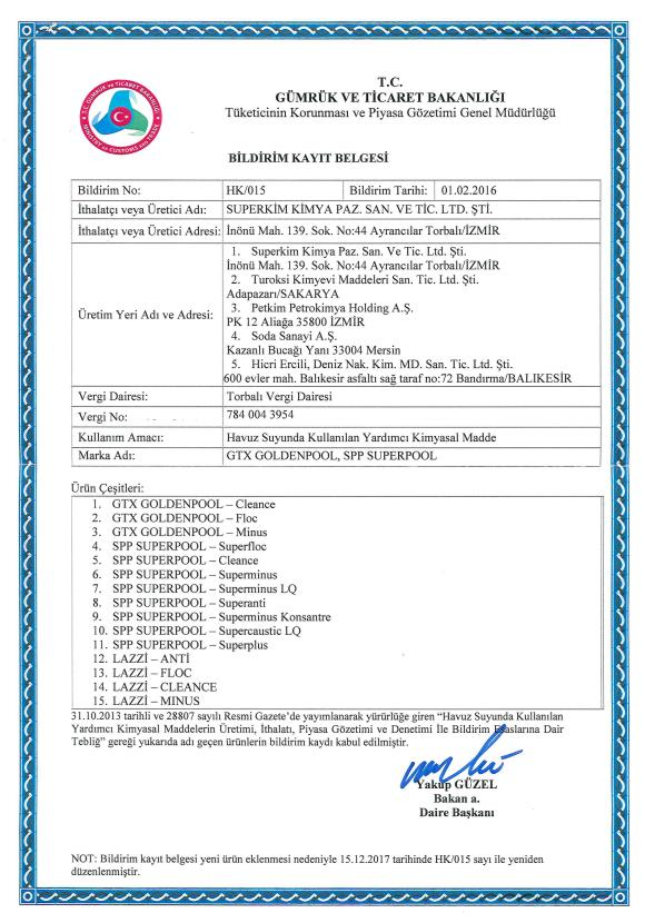 Kullanım Amacı: Yüzme havuzu suyunda kirliliğe sebep olan askıda katı maddelerin topaklanarak çökmesini sağlar. Bu topaklayıcı özelliği sayesinde birleşip çöken kirlilikler dip süpürgesi ile havuz dışına atılarak havuz suyu daha berrak görünmesini sağlar.